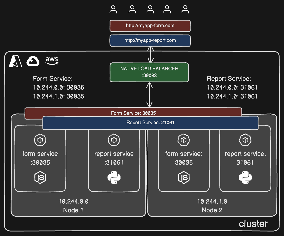 Suppose we have two backend services Form Service & Report Service replicated across multiple pods and on multiple nodes.