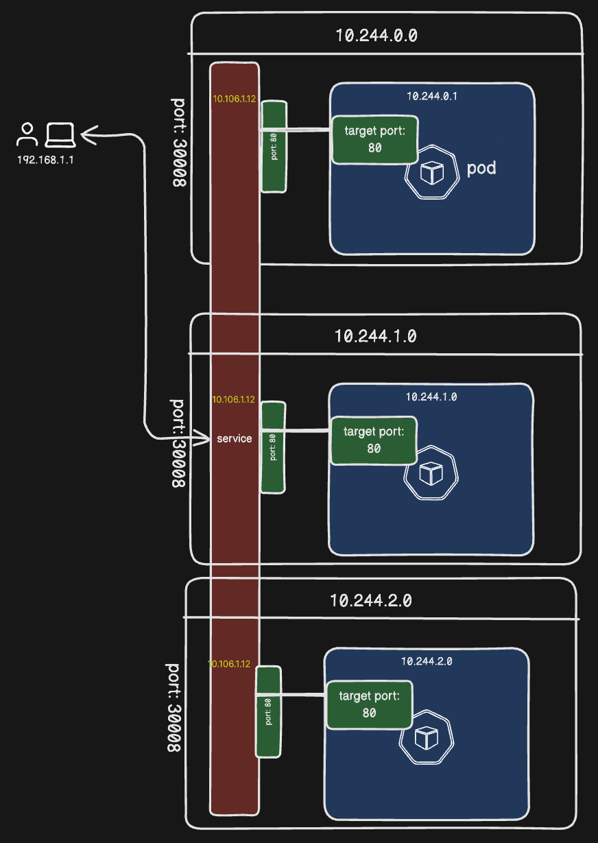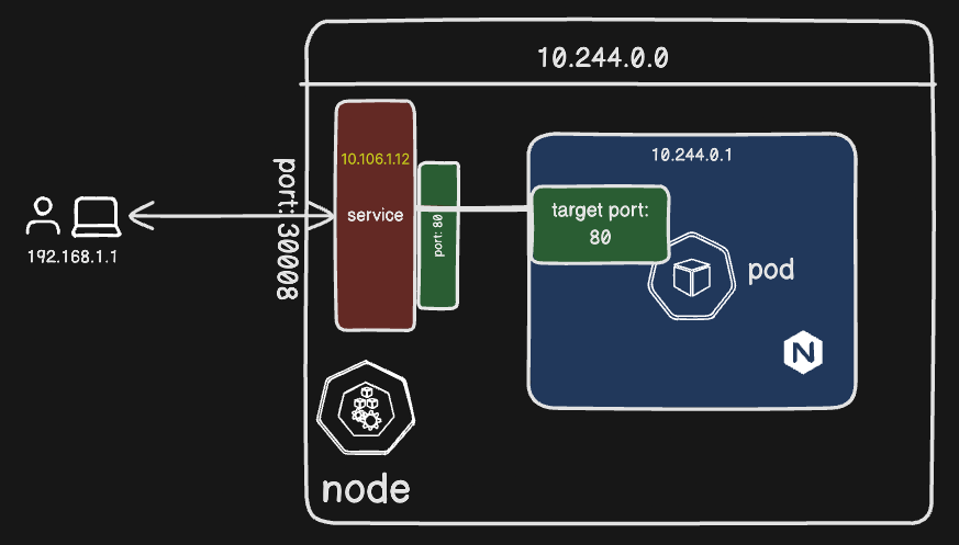 provides external access to the application by mapping port on the node -> port on the pod.